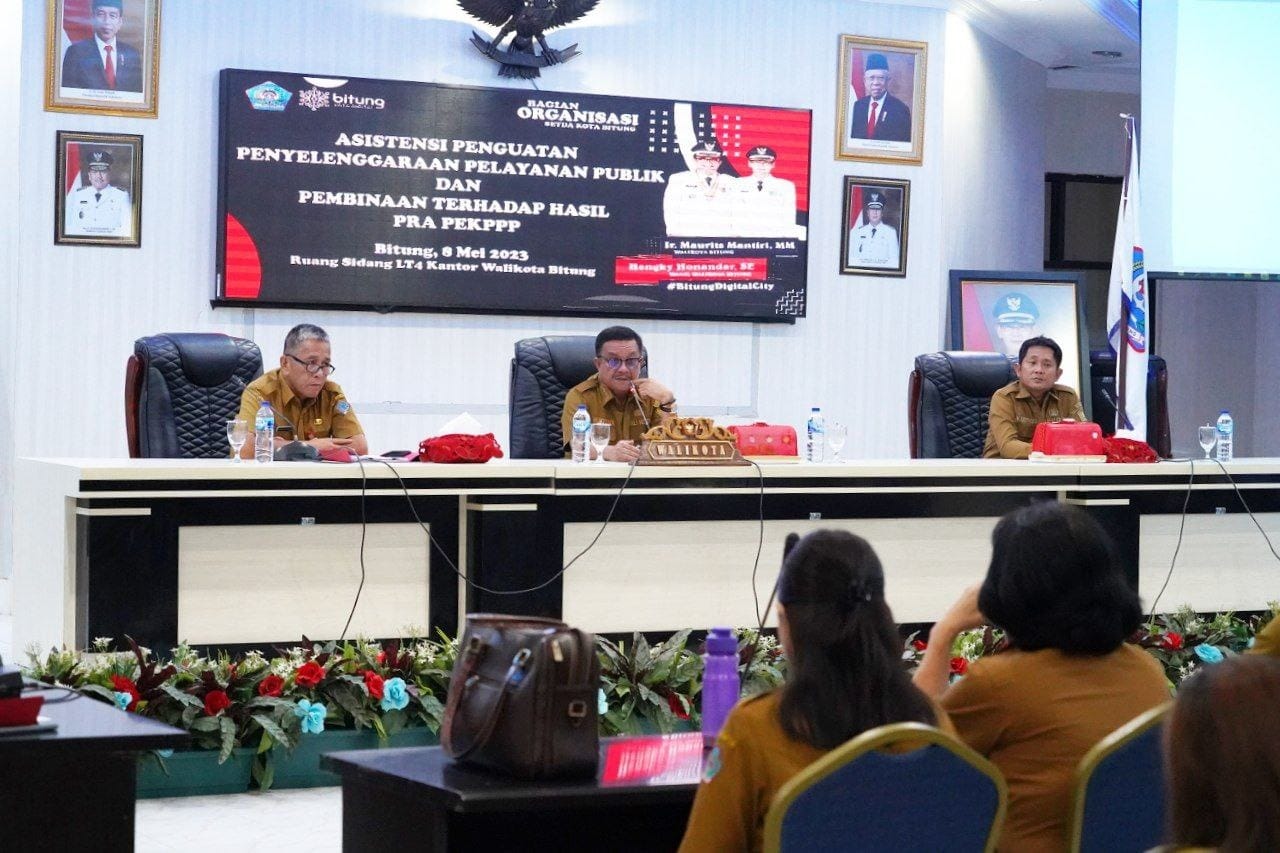 BITUNG – Wal Kota Bitung, Maurits Mantiri gelar kegiatan Asistensi Evaluasi Kinerja Pelayanan Publik bertempat di lantai 4 Kantor Wali Kota, Senin (08/05/2023).