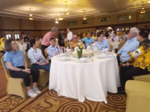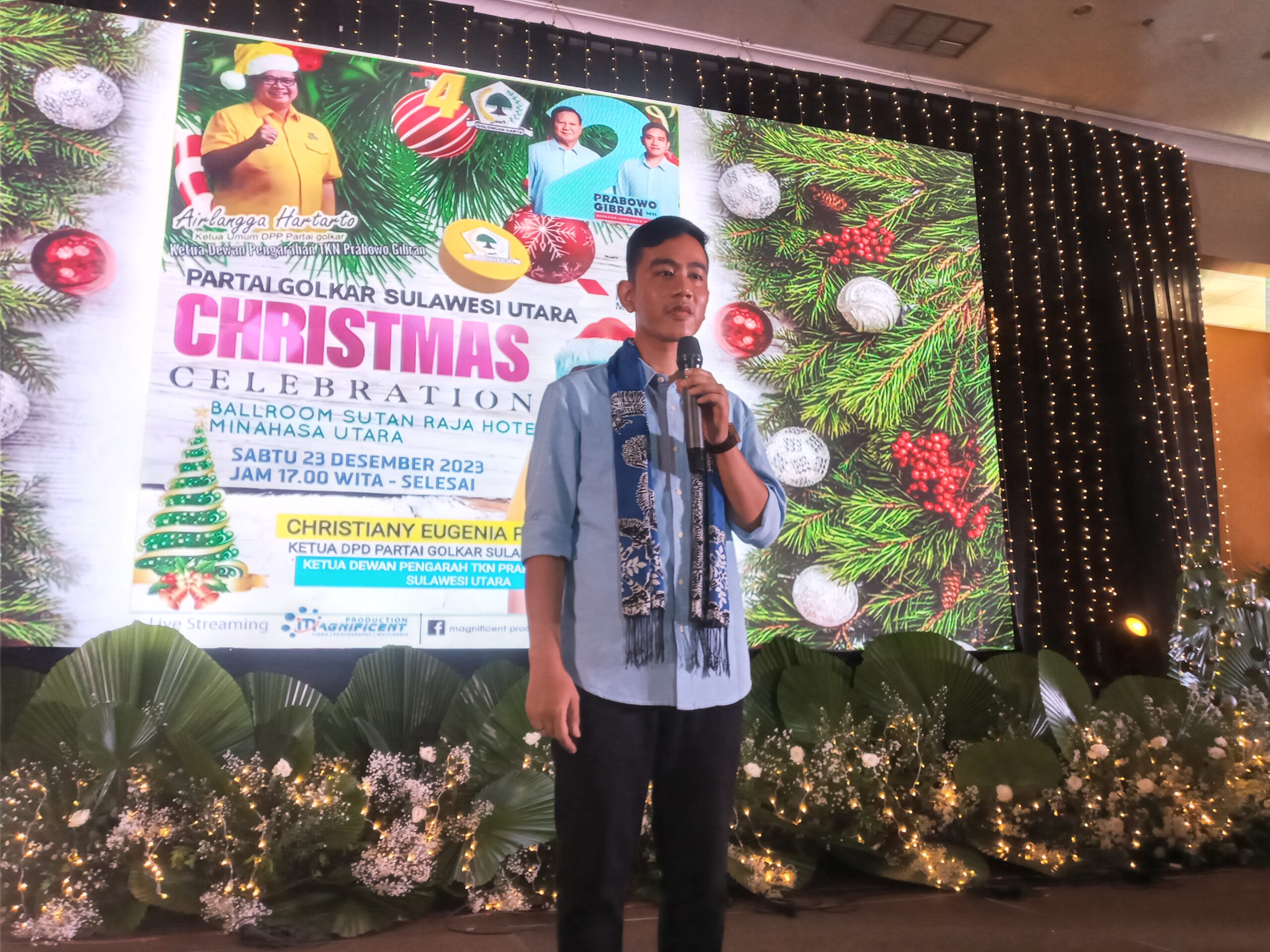 MINUT-Setelah mengikuti debat perdana, Calon Wakil Presiden (Cawapres) RI Gibran Rakabuming Raka melakukan kunjungan ke Sulawesi Utara (Sulut). Selama dua hari di Bumi Nyiur Melambai Gibran yang didampingi sang istri Selvi Ananda, Emil Dardak, Arumi Bachin, Grace Natalie, dan Tim Kampanye Nasional (TKN) Prabowo Subianto-Gibran Rakabuming Raka mengikuti sejumlah kegiatan. Putra Presiden Joko Widodo (Jokowi) itu, menghadiri acara Christmas Celebration Partai Golongan Karya (Golkar) Sulut bersama Tim Kampanye Daerah (TKD) Prabowo-Gibran Sulut, di ballroom Hotel Sutanraja, Minahasa Utara (Minut), Jumat (23/12/2023) malam. Begitu tiba di lokasi acara Gibran dan rombongan disambut Ketua DPD Partai Golkar Sulut sekaligus Ketua Dewan Pengarah TKD Capres Prabowo Subianto dan Cawapres Gibran Rakabuming Raka Sulut, Christiany Eugenia Paruntu, Ketua TKD Prabowo-Gibran Sulut Conni L Rumondor, dan Bendahara TKD Capres Prabowo Subianto dan Cawapres Gibran Rakabuming Raka Sulut Mona Kloer. Kidung pujian rohani berjudul Hallelujah yang dilantunkan tim paduan suara Fricilia Mixed Choir mengiringi Cawapres nomor urut 2 itu saat memasuki ballroom Hotel Sutanraja. Acara diawali ucapan selamat datang oleh Ketua DPD Partai Golkar Sulut sekaligus Ketua Dewan Pengarah TKD Capres Prabowo Subianto dan Cawapres Gibran Rakabuming Raka Sulut Christiany Eugenia Paruntu, dan sambutan Ketua TKD Prabowo-Gibran Sulut Conni L Rumondor. Dalam sambutannya Conni mengatakan, target kemenangan Prabowo-Gibran di Sulut 70 persen dalam satu putaran saja. Sembari memuji penampilan Gibran di debat Cawapres, Conni optimis Indonesia semakin maju di tangan Prabowo-Gibran. Saat menyampaikan sambutannya Gribran mengimbau para pendukung untuk tidak percaya dengan hoaks atau kabar bohong. “Bapak dan ibu mohon jangan ditanggapi, tetap kerja keras, dan jangan terbuai dengan hasil survei. Saya dan bapak Prabowo akan menguatkan dan menyempurnakam program yang sudah ada. Selamat Natal dan Tahun Baru, dan saya mungkin satu-satunya calon yang mengucapkan selamat Natal,” kata Gibran yang disambut aplaus meriah hadirin. Hadir di acara Christmas Celebration Partai Golkar bersama TKD Prabowo-Gibran Sulut. Ketua Penasihat TKD Prabowo-Gibran Sulut Jimmy Rimba Rogi bersama Ny Irawati Rogi-Saleh dan keluarga, Sekretaris Partai Golkar Sulut Raski Mokodompit, Bendahara Partai Golkar Sulut Inggried Sondakh, Theo Sambuaga, Ketua DPP Partai Golkar Jerry Sambuaga, Ronny Sompie, para ketua DPD Golkar kabupan/kota se Sulut, dan para Caleg Partai Golkar se Sulut, dan para ketua kordinator dan anggota TKD Prabowo-Gibran Sulut.