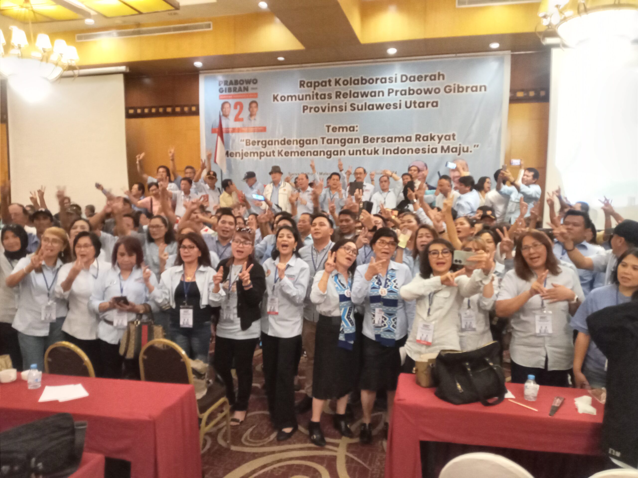 MANADO-Meski semua lembaga survei menempatkan pasangan Calon Presiden (Capres) Prabowo Subianto-Calon Wakil Presiden (Cawapres) Gibran Rakabuming Raka di posisi teratas dalam hasil surveinya, namun Ketua Umum DPN Gugus Tugas Indonesia Raya (Getar 08) Dr Jimmy Rol Torar Bsc, SE, MM, MAP, mengimbau para relawan tetap bekerja keras dan solid untuk memenangkan Capres Prabowo Subianto-Cawapres Gibran Rakabuming Raka satu putaran di Pemilu Presiden (Pilpres) 14 Februari 2024 nanti. Hal itu disampaikan Jimmy Rol Torar di acara Rapat Kolaborasi Daerah (Rakorda) Komunitas Relawan Prabowo-Gibran Sulawesi Utara (Sulut), di Swiss-Belhotel Maleosan Manado, Jumat (19/1/2024). Acara bertema Bergandengan Tangan Bersama Rakyat Menjemput Kemenangan Untuk Indonesia Maju, diawali menyanyikan lagu Indonesia Raya,  mengheningkan cipta, dan berdoa dipimpin Pnt Julen Bawias. Rapat Rakorda  Komunitas Relawan Prabowo-Gibran Sulut menampilkan dua pembicara yaitu Brigjen TNI (Purn) Yorry Tuwaidan dan Brigjen TNI (Purn) Rudolf Warouw. Sebelum menyampaikan pemaparannya tentang strategi pemenangan Capres Prabowo Subianto-Cawapres Gibran Rakabuming Raka, Brigjen TNI (Purn) Yorry Tuwaidan, merepons positif antusias peserta Rakorda Komunitas Relawan Prabowo-Gibran Sulut. “Kalau hanya mengetahui kemampuan lawan, tapi tidak tahu kemampuan sendiri, maka kita hancur,” kata Brigjen Purn Yorry Tuwaidan. Pembicara Brigjen TNI (Purn) Rudolf Warouw memaparkan materi bertajuk Kiat-Kiat Pasangan Calon (Paslon) Nomor 2 Dalam Memenuhi Aspirasi Masyarakat. “Para relawan terdiri dari berbagai unsur, dan relawan harus tahu kondisi di sekitarnya dan harus menghilangkan egois,” ujar Brigjen TNI (Purn) Rudolf Warouw. Sementara itu Ketua Bidang Pengamanan Tim Kampanye Daerah (TKD) Prabowo-Gibran Sulut Letnan Kolonel (Letkol) Infanteri (Purn) Hendrik I Darenoh juga mengapresiasi pelaksanaan Rakorda Komunitas Relawan Prabowo-Gibran Sulut. “Acaranya luar biasa dan meriah. Semangat juang untuk memenangkan bapak Prabowo Subianto dan Gibran Rakabuming Raka sangat tinggi. Mari torang samua pertahankan dan tingkatkan hal-hal baik menjelang Pemilu,” kata Letkol Infanteri (Purn) Hendrik I Darenoh kepada radarmanadoonline.com. Diakhir acara, para perwakilan relawan bergoyang gemoy bersama diiringi lagu Oke Gas dilanjutkan menyanyi bersama lagu berjudul Kemesraan bersama dua penyanyi Sulut Jeane Hanibe dan Vina Vinorika Zees. Hadir di Rakorda Komunitas Relawan Prabowo-Gibran Sulut tersebut Bambang Priambodo, Letnan Kolonel (Purn) Robby Mongisidi, Kordinator Bidang Media Relation TKD Prabowo-Gibran Sulut Septian Paat, Ketua Relawan Berkarya Nasional (RBN) Sulut Folter Wangoi, para Calon Legislatif (Caleg) partai Koalisi Indonesia Maju (KIM),  dan para ketua relawan se Sulut.(axm)