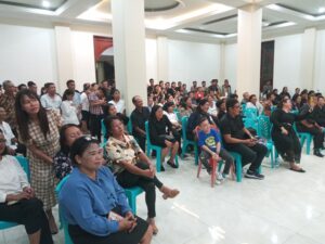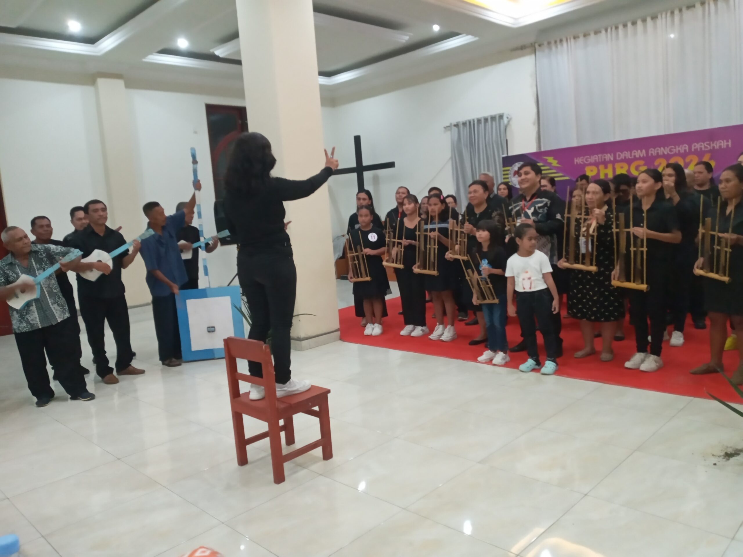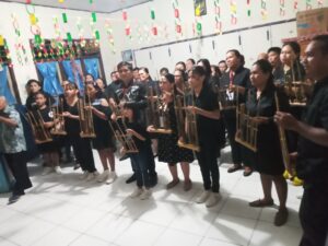 MANADO-Menjulang Nyata Atas Bukit Kala, T’rang Benderang Salib Mu Tuhanku, Dari Sinarnya Yang Menyala-Nyala Memancar Kasih Agung dan Restu…, Itulah bait kidung pujian rohani berjudul Menjulang Nyata Atas Bukit Kala. Kidung pujian di Kidung Jemaat Nomor 183 itu dilantunkan oleh Kolom 2 Jemaat GMIM Eben Haezer Kombos, di lomba Pujian Nada dan Simphony yang dihelat di lantai 1 Gereja GMIM Eben Haezer Kombos, Wilayah Manado Wawonasa Kombos, Senin (11/3/2024) malam. Diketahui, Lomba Pujian Nada dan Simphony merupakan rangkaian kegiatan panitia Hari-Hari Raya Gerejawi (PHRG) Jemaat GMIM Eben Haezer Kombos 2024 menjelang Jumat Agung dan Paskah Kebangkitan Yesus Kristus. Lomba Pujian Nada dan Simphony yang disambut antusias peserta dan jemaat di 19 kolom tersebut diawali ibadah dipimpin Pdt Amelia Maringka ST.h. Dari seluruh peserta yang tampil di Lomba Pujian Nada dan Simphony di malam itu, jemaat kolom 2 tampil beda. Kolom 2 yang berkuatan 40 anggota ini menggunakan alat musik tradisional asal Jawa Barat (Jabar), Angklung. Meski fokus latihanya di injury time pelaksanaan lomba, namun kolom 2 mampu tampil memukau di hadapan tiga dewan juri dan ratusan jemaat yang memenuhi ruangan lantai 1 Gereja GMIM Eben Haezer Kombos. Ketiga pengadil ini yaitu Imelda Matheos, Verrena Katiangdagho, dan Febrian Tamaka (ketua). Tampilnya tiga pendeta dan guru agama yakni Pdt Cherlie J Muskitta-Pangau S.Th, Pdt Edger Runtulalo S.Th, Pdt Amelia Maringka S.Th, dan GA Onitje Umboh menambah spirit dan kekompakan kolom 2. Tak hanya itu, meski hanya hitungan menit dalam mengharmonisasi nada alat musik angklung sebelum tampil, namun anggota kolom 2 bisa memainkannya dengan baik dalam mengiringi lagu Menjulang Nyata Atas Bukit Kala. Kidung pujian rohani lain yang dilantunkan para peserta Lomba Pujian Nada dan Simphony diantara berjudul Pengharapanku, Kendati Hidupku, Bukan Dengan Barang Fana, dan Karya Terbesar. Sesuai hasil penilaian juri, pemenang pertama diraih oleh Jemaat GMIM Eben Haezer Kombos kolom 19, juara 2 kolom kolom 18, juara ketiga kolom 7, harapan 1 kolom 2, harapan 2 kolom 6, dan harapan 3 kolom 9. Sementara itu setelah Lomba Pujian Nada dan Simphony, kegiatan lain yang akan digelar terkait perayaan Jumat Agung dan Paskah Kebangkitan Yesus Kristus di Jemaat GMIM Eben Haezer Kombos, yakni Pawai dan Ibadah Paskah pada 31 Maret 2024 mulai pukul 04.30 Wita, dan Lomba Gerak dan Lagu pada pukul 11.00 Wita di gedung Gereja GMIM Eben Haezer Kombos.(axm)