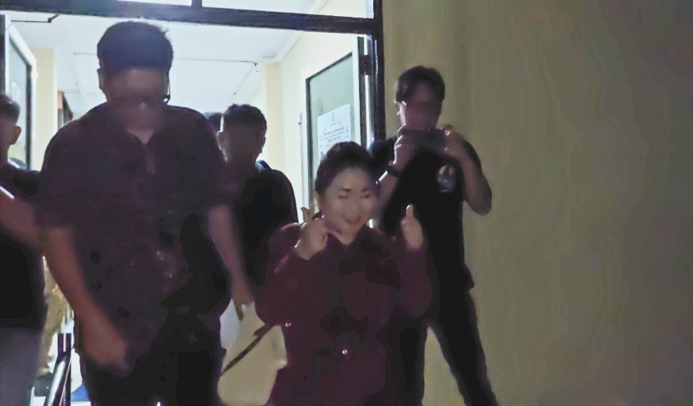 Oknum Caleg DPRD Sulut Jeane Laluyan (kemeja merah bergaris hitam) didampingi kusa hukum saat keluar dari ruang penyidik di Mapolda Sulut, Kamis (22/2/2024) malam. (foto/Jufri Mantak)