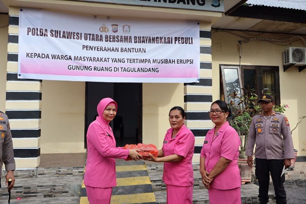 Sebelum mengunjungi Polsek Tagulandang, Kapolda dan Ketua PD Bhayangkari Sulut bersama Wakil Gubernur serta Forkopimda Sulut memberikan bantuan secara simbolis bagi warga masyarakat, di Posko Terpadu Penanggulangan Bencana Gunung Ruang, yang berada di Kampung Apengsala, Kecamatan Tagulandang Utara.