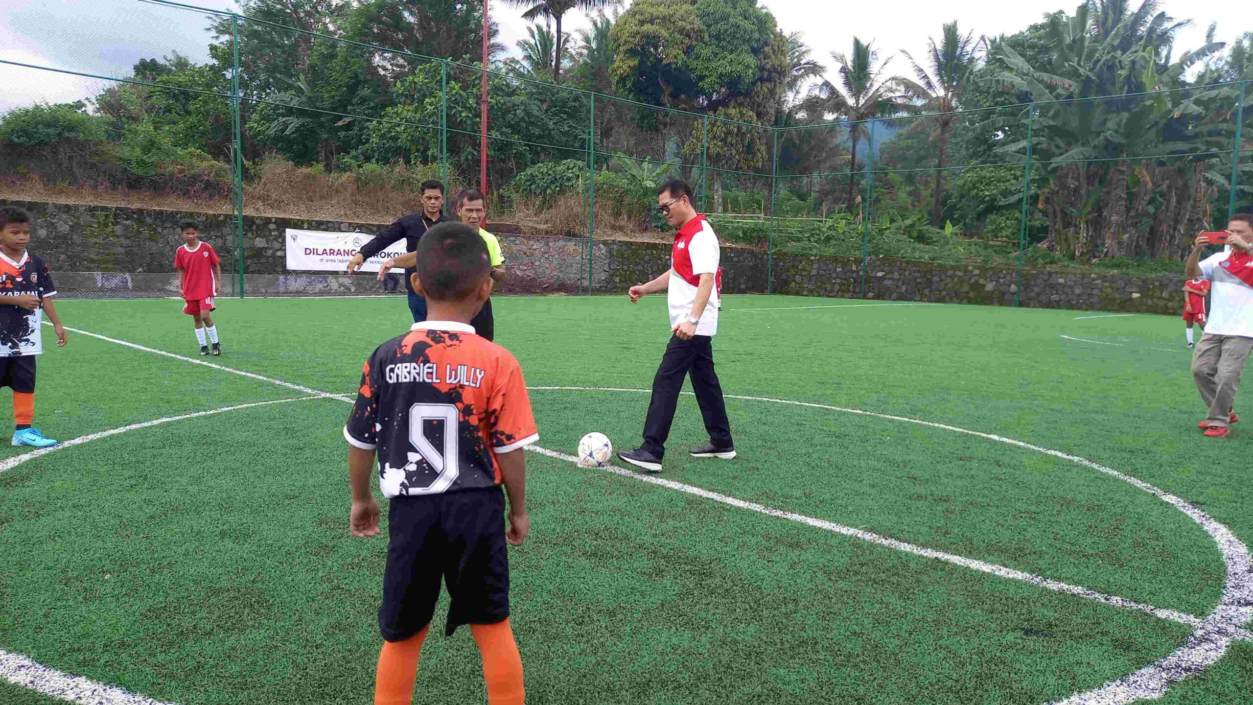 Bupati Joune Ganda saat menendang bola dalam pembukaan Liga Bupati Minut 2024 U-10 dan U-12. foto: Rommy