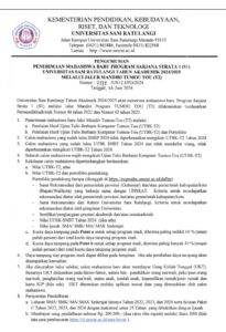 Pengumuman tersebut tertuang dalam surat Nomor: 7272/UN12.I/PD/2024 tanggal 26 Juni 2024 berdasarkan Permendikbudristek nomor 48 tahun 2022 dan nomor 62 tahun 2023 yang ditandatangani Wakil Rektor Bidang Akademi Prof. Dr. Ir. Grevo S. Gerung. MSc.