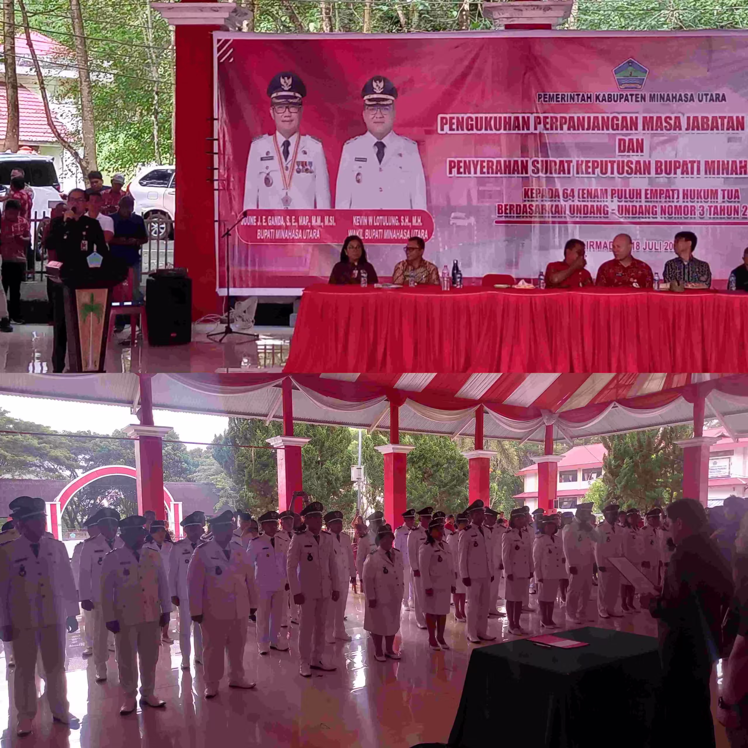 MINUT,Radarmanadoonline com_ Bupati Joune Ganda mengukuhkan perpanjangan masa jabatan 64 Hukum Tua se-kabupaten Minahasa Utara, di Pendopo Kantor Bupati Minut, Kamis (18/07/24).
