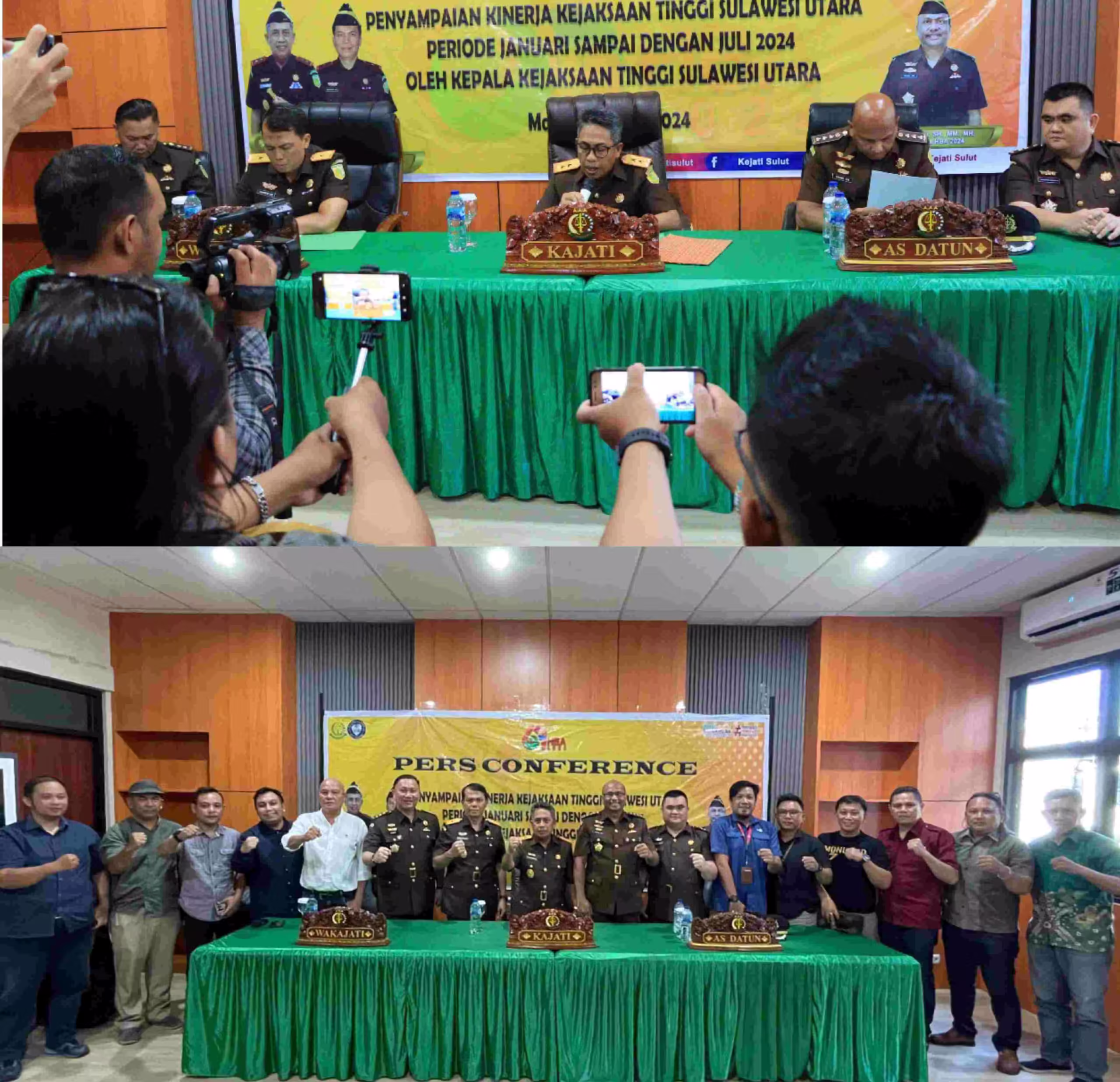Press Conferensi dipimpin langsung Kajati Sulut didampingi Wakajati Dr.Transiswara Adhi, SH,M.Hum, Asisten Perdata dan Tata Usaha Negara Frenkie Son, SH,MM,MH, Selaku Ketua HBA Ke-64 Kejati Sulut, Kepala Bagian Tata Usaha Sterry Fendi Andih, SH, MH dan Kepala Seksi Penerangan Hukum dan Humas Theodorus Rumampuk, SH,MH.
