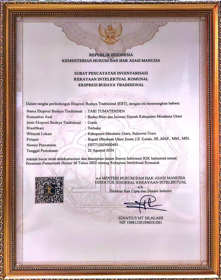 Kabupaten Minahasa Utara menerima Sertifikat HAKI atas Ekspresi Budaya Tradisional (EBT) Kabupaten Minahasa Utara “Tari Tumatenden”.