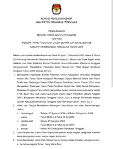 Pengumuman ini tertuang dalam NOMOR : 612/PL.02.2-Pu/7107/2/2024 tentang Pendaftaran Pasangan Bupati dan Wakil Bupati tahun 2024, dan di tanda tangani langsung oleh Ketua KPU Mitra Otnie N. Tamod.