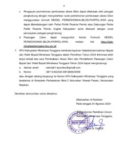 Tak lupa KPU Mitra membuka layanan helpdesk Pencalonan Bupati dan Wakil Bupati terkait informasi lebih lanjut melalui Alamat email: [email protected], atau Nomor: 08114302326 /081368509399, atau bisa juga dengan datang langsung ke Kantor KPU Kabupaten Minahasa Tenggara yang beralamat di Kompleks Perkantoran Blok.C Kelurahan Wawali Pasan, Kecamatan Ratahan.