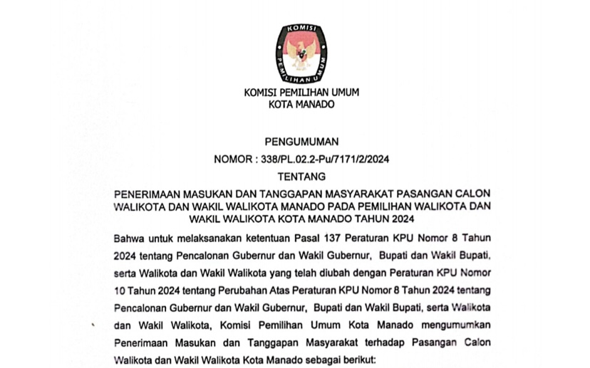 Bahwa untuk melaksanakan ketentuan Pasal 137 Peraturan KPU Nomor 8 Tahun 2024 tentang Pencalonan Gubernur dan Wakil Gubernur, Bupati dan Wakil Bupati, serta Walikota dan Wakil Walikota yang telah diubah dengan Peraturan KPU Nomor 10 Tahun 2024 tentang Perubahan Atas Peraturan KPU Nomor 8 Tahun 2024 tentang Pencalonan Gubernur dan Wakil Gubernur, Bupati dan Wakil Bupati, serta Walikota dan Wakil Walikota, Komisi Pemilihan Umum Kota Manado mengumumkan Penerimaan Masukan dan Tanggapan Masyarakat terhadap Pasangan Calon Walikota dan Wakil Walikota Kota Manado sebagai berikut: