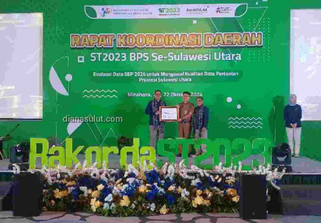 Penghargaan yang diberikan oleh Inspektur Utama Badan Pusat Statistik (BPS) Republik Indonesia, Dr. Dadang Hardiawan, S.Si.,M.Si diterima Sekretaris Daerah Ir Novly Wowiling, M.Si mewakili Pjs. Bupati Minahasa Utara.