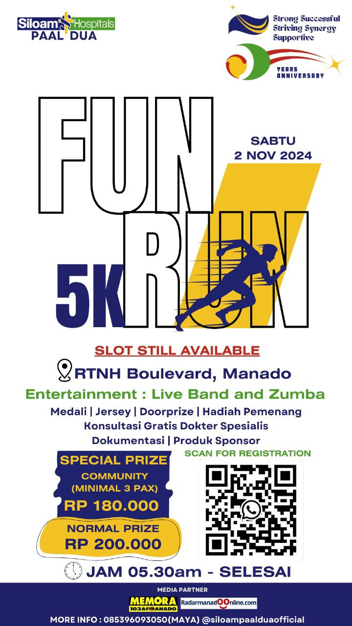 MANADO,radarmanadoonline.com-5K Fun Run Siloam Hospitals Paal Dua berlangsung pada 2 November 2024, di RTNH Pasir Putih, Boulevard, Manado. Panitia sudah membuka pendaftaran peserta sejak beberapa waktu lalu. Dan, pendaftaran peserta 5K Fun Run Siloam Hospitals Paal Dua ditutup pada 1 November atau sehari sebelum event bergulir. Hal tersebut disampaikan oleh Ketua Panitia 5th Anniversary of Siloam Hospital Paal Dua Celebration, Ns. Yulia Lumentut, S.Kep pada press conference, yang berlangsung di meeting room lantai 2, Rumah Sakit (RS) Siloam Paal Dua, Senin (28/10/2024).