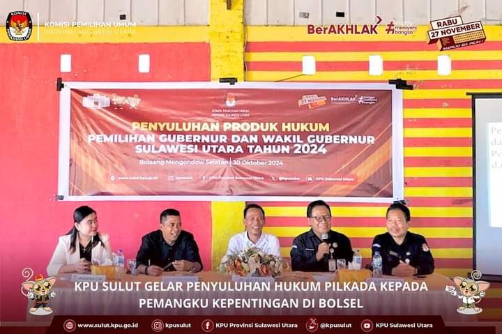 BOLSEL,Radarmanadoonline.com_Dalam rangka penyebarluasan informasi produk hukum Pemilihan Gubernur Dan Wakil Gubernur Sulawesi Utara Tahun 2024, KPU Sulut kembali menyelenggarakan Penyuluhan Produk Hukum Pemilihan Gubernur Dan Wakil Gubernur Sulawesi Utara Tahun 2024 kepada pemangku kepentingan di Kabupaten Bolaang Mongondow Selatan (Bolsel). Kegiatan dilaksanakan di RM Queen, Kabupaten Bolsel, pada hari Rabu, (30/10).