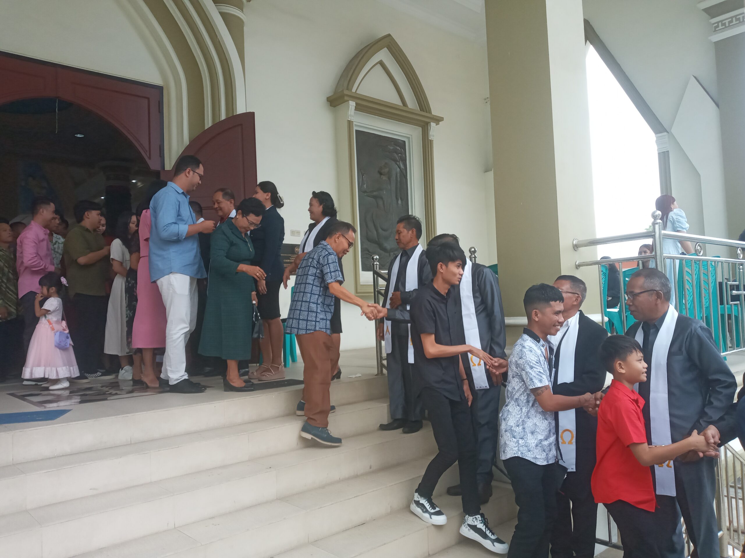PELAYANAN: Para Pelsus penerima jemaat ibadah awal tahun 2025 di Gereja GMIM Eben Haezer Kombos, Rabu (1/1/2025) pagi.(FOTO/ALEX MAMAHIT)