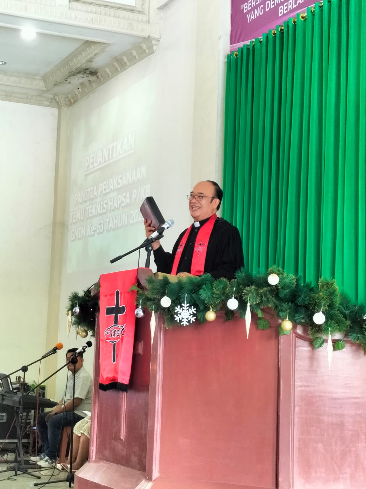 Pnt Maurits Mantiri yang juga Wali Kota Bitung ini, menyarankan kepada panitia Temu Teknis Hapsa P/KB GMIM 2025 untuk bekerja kompak dan tidak bersungut-sungut, Saat menyampaikan sambutan, Pnt Jacob Umar mengatakan bersyukur dan bangga dipercayakan menjadi ketua umum panitia Temu Teknis Hapsa P/KB GMIM 2025. “Puji nama Tuhan kita Yesus Kristus sebagai Kepala Gereja atas kasih dan kemurahaNya, kita boleh menikmati kasih dan rahmatNya. Kita telah diberi waktu, kesempatan, dan sukacita di saat ini. Kita ada dalam persekutuan perjumpaan dan didalamnya kita boleh melaksanakan panggilan pelayanan,” kata Pnt Jacob Umar. Dikatakan Ketua P/KB GMIM Eben Haezer Kombos ini, pelantikan panitia Temu Teknis Hapsa P/KB GMIM 2025 telah berlangsung dengan segala baik. “Untuk itu, saya pribadi merasa bersyukur dan bangga ketika saya dipercayakan menjadi ketua umum Temu Teknis Hapsa PKB GMIM Tahun 2025 ini. Biarlah pekerjaan pelayanan yang mulia ini akan menjadi berkat demi kemuliaan nama Tuhan,” ujarnya. Pnt Jacob Umar juga nengatakan, dia bersama dengan panitia lainya akan bekerja sesuai dengan aturan-aturan yang ada dan melaksanakan tugas idengan penuh sukacita. “Biarlah kita saling kerjasama, berjalan dengan baik, saling menopang, dan topangan dari seluruh jemaat GMIM Eben Haezer Kombos agar kegiatan (Temu Teknis Hapsa P/KB GMIM 2025, red) ini boleh berjalan dengan baik sesuai kehendak Tuhan,” katanya. Hadir di ibadah sekaligus pelantikan panitia Temu Teknis Hapsa P/KB GMIM 2025 Ketua Badan Pekerja Majelis Jemaat (BPMJ) GMIM Eben Haezer Kombos Pdt Cherlie J Muskitta-Pangau S.Th.