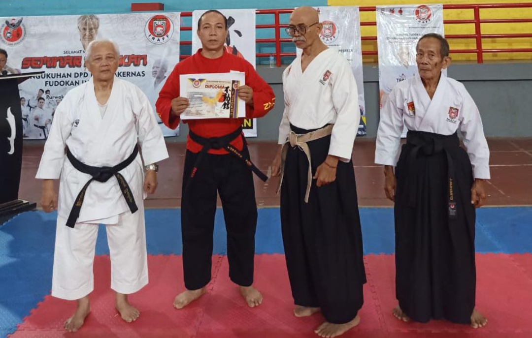 Ketua Umum INAFF Indonesia Ir Eben Heizer Sembiring usai menyerahkan sertifikat Diploma Sabuk Hitam DAN V kepada E.K Tindangen SH diapit 2 guru besar Fudokan samping kanan dan kiri