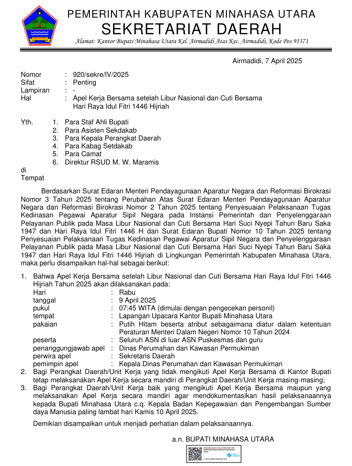 Pengumuman ini disampaikan lewat Surat Edaran Pemkab Minut Nomor: 920/sekre/IV/2025, tertanggal 7 April 2025.