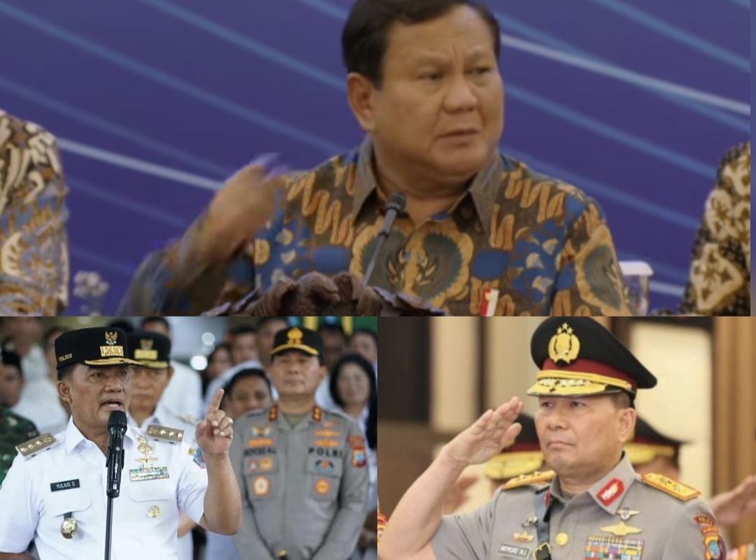 Presiden RI Prabowo Subianto (atas), Gubernur Sulut Yulius Selvanus (kiri bawa), Kapolda Sulut Irjen Pol Roycke Langie (kanan bawa).