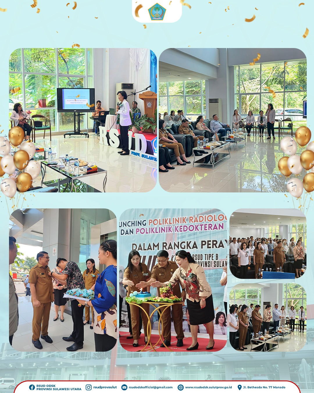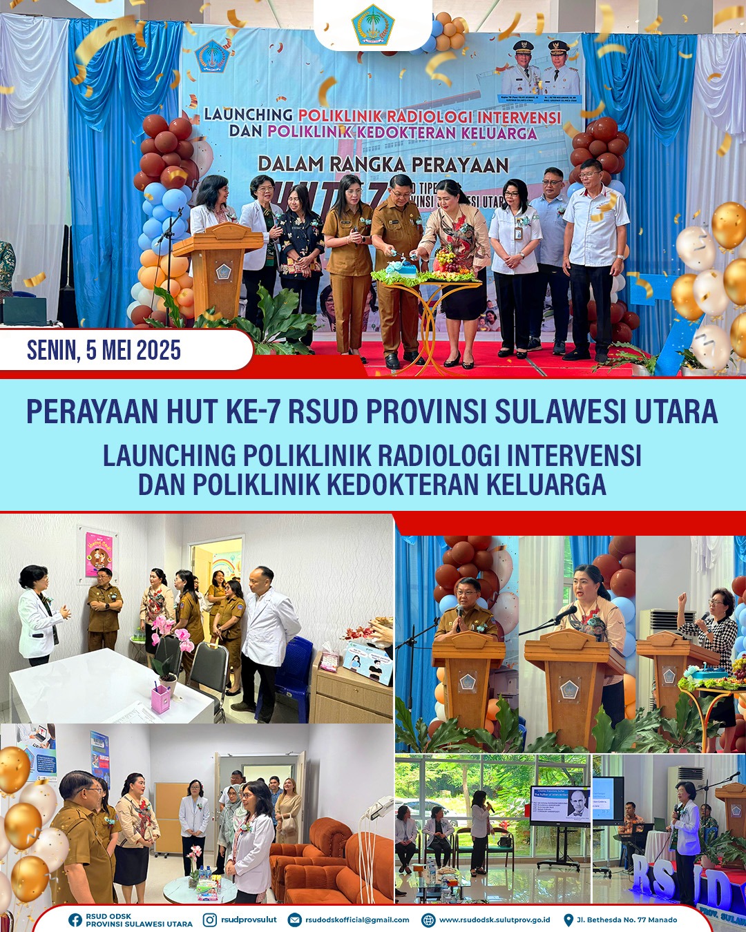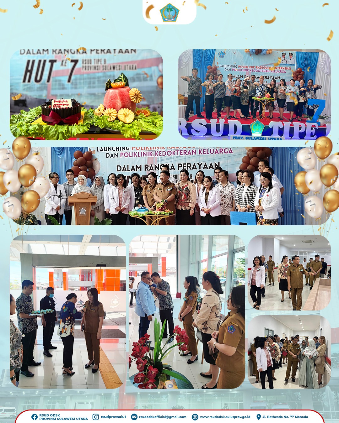 yang berbasis pada mutu dan kemanusiaan sesuai visi misi Pemerintah Provinsi Sulawesi Utara demi Sulut Maju, Sejahtera dan Berkelanjutan,” ujar dr Lidya. Rangkaian kegiatan HUT ke-7 RSUD Tipe B Provinsi Sulut telah dilaksanakan sejak Maret 2025, dengan kegiatan di internal rumah sakit untuk seluruh keluarga besar RSUD Tipe B Provinsi Sulut maupun kegiatan ilmiah, dengan berbagai Workshop yang melibatkan narasumber dari Kemenkes RI. Kegiatan lain yakni Konsultan Perumahsakitan nasional, bakti sosial kesehatan di Panti Senja Cerah, masjid irsyadul untuk korban pasca banjir Kota Manado, dan panti asuhan anak sebagai bagian dari hari raya idul fitri, dan Panti Disabilitas Netra Bartemeus GMIM, sebagai bagian dari kegiatan Paskah Kebangkitan Tuhan Yesus Kristus 2025. Gubernur Sulut Mayjen TNI (Purn) Yulius Selvanus yang disampaikan oleh Asisten 1 Pemerintahan dan Kesra Setda Provinsi Sulut Dr.Denny Mangala M.Si, mengapresiasi pembukaan pelayanan inovasi di RSUD Tipe B Provinsi Sulut, yang bertujuan untuk mendekatkan akses pelayanan kesehatan yang prima dan bermutu tinggi, dengan dukungan teknologi canggih dan dokter-dokter spesialis terbaik di Sulut bahkan Indonesia, serta memastikan seluruh jajaran civitas hospitalia RSUD