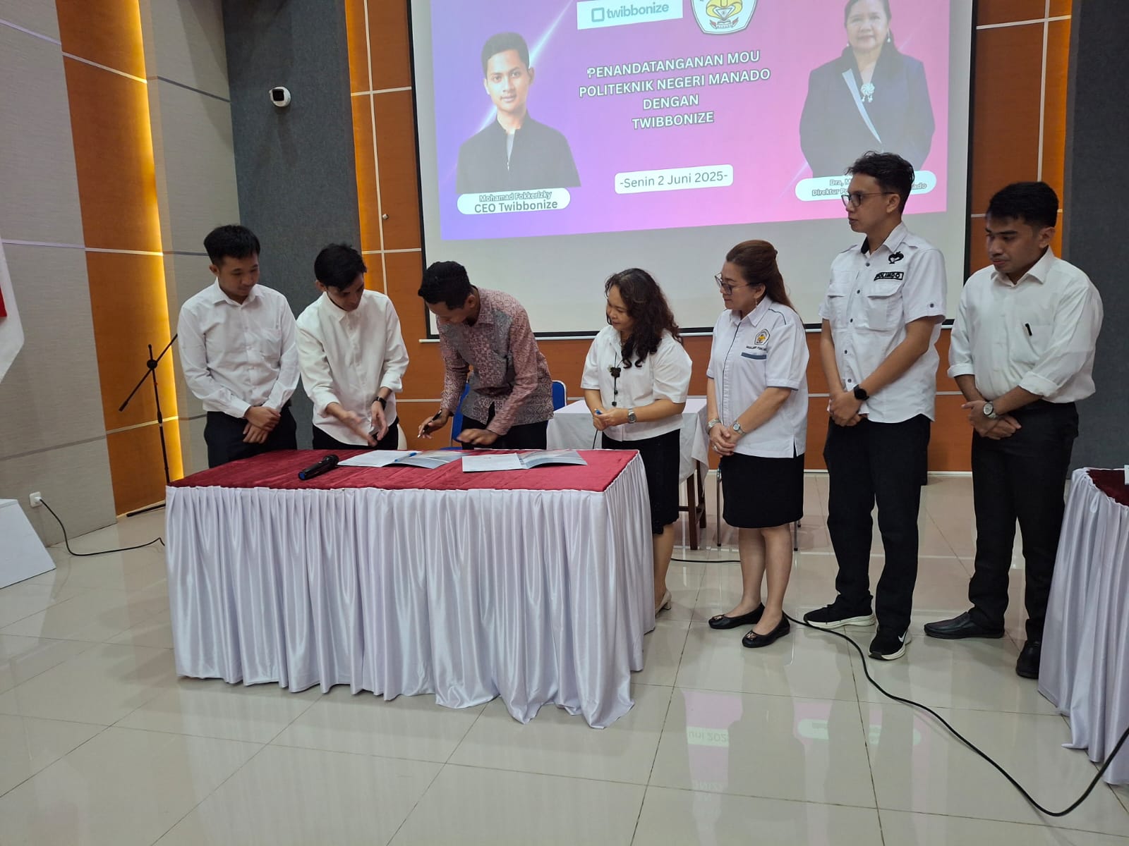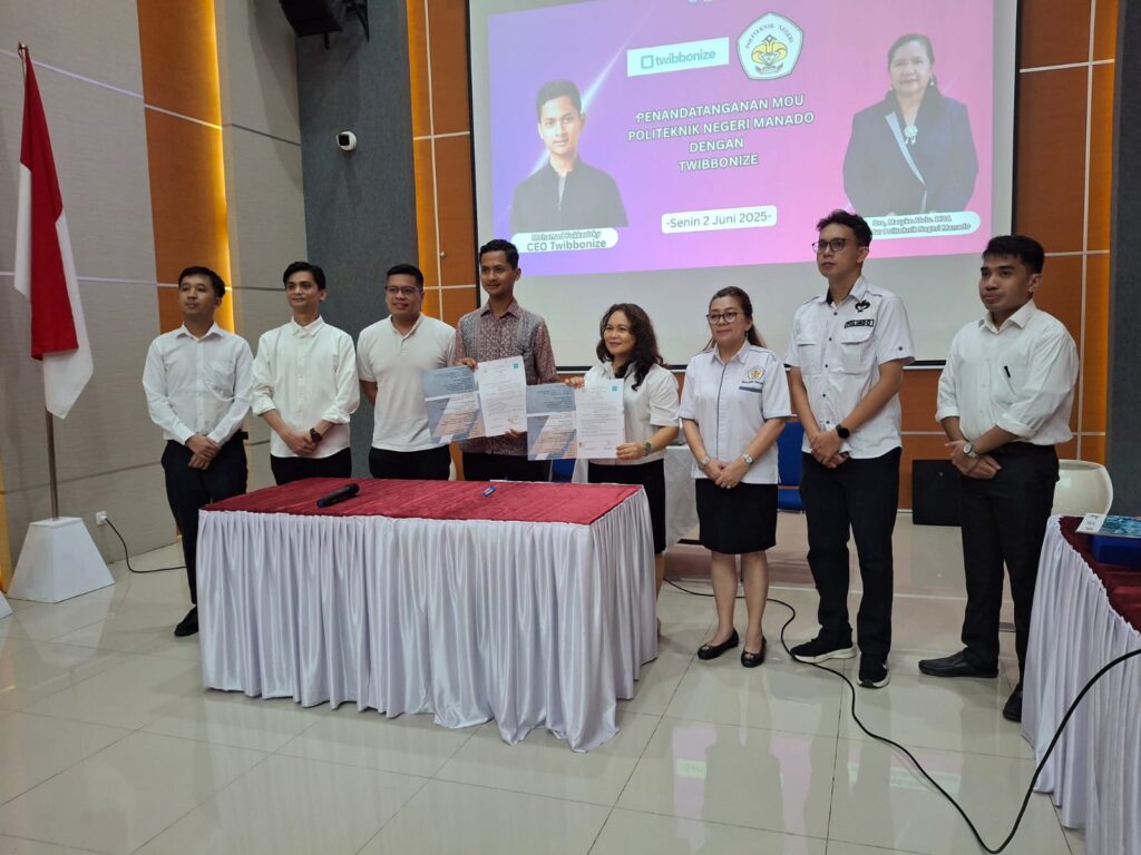 MANADO, Radarmanadoonline.com — Politeknik Negeri Manado (Polimdo) menandatangani nota kesepahaman (MoU) dengan startup digital nasional, Twibbonize, di Gedung Kuliah Terpadu, Senin (2/6/2025). Kerja sama ini bertujuan memperkuat strategi branding dan digitalisasi kampus dalam menghadapi tantangan era transformasi digital.