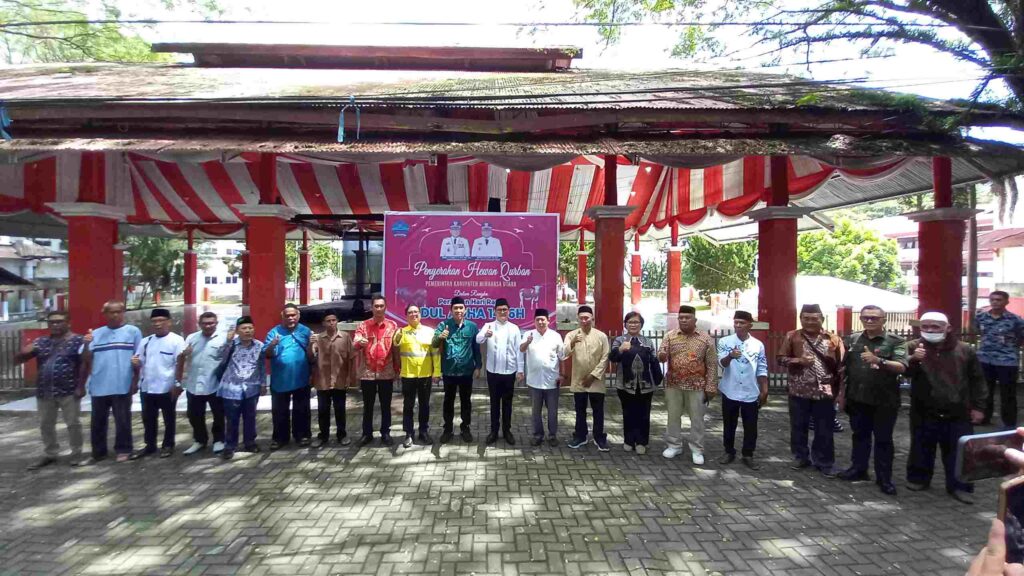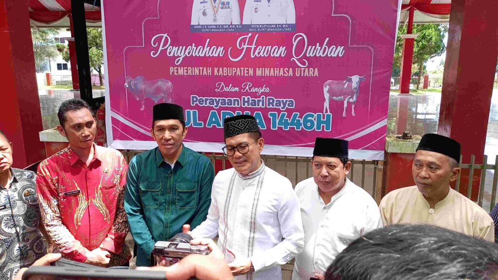 Penyerahan hewan kurban diserahkan langsung Bupati Joune Ganda kepada para Imam dan pengurus masjid didampingi Ketua PHBI Minut Sarhan Antili, di Kompleks Pendopo Kantor Bupati Minut, Kamis (05/06/25).