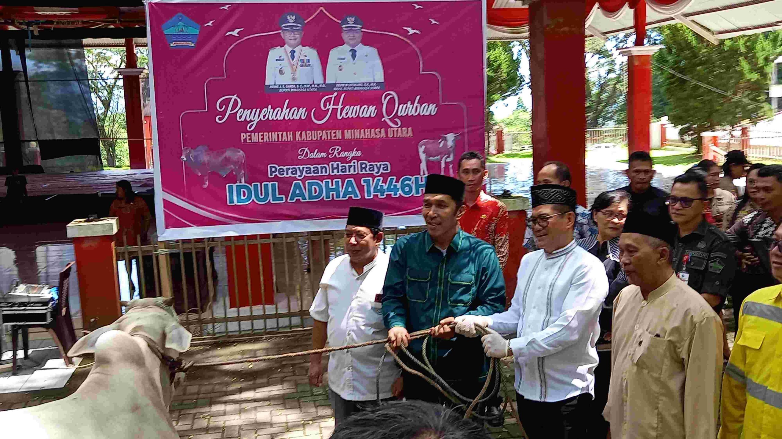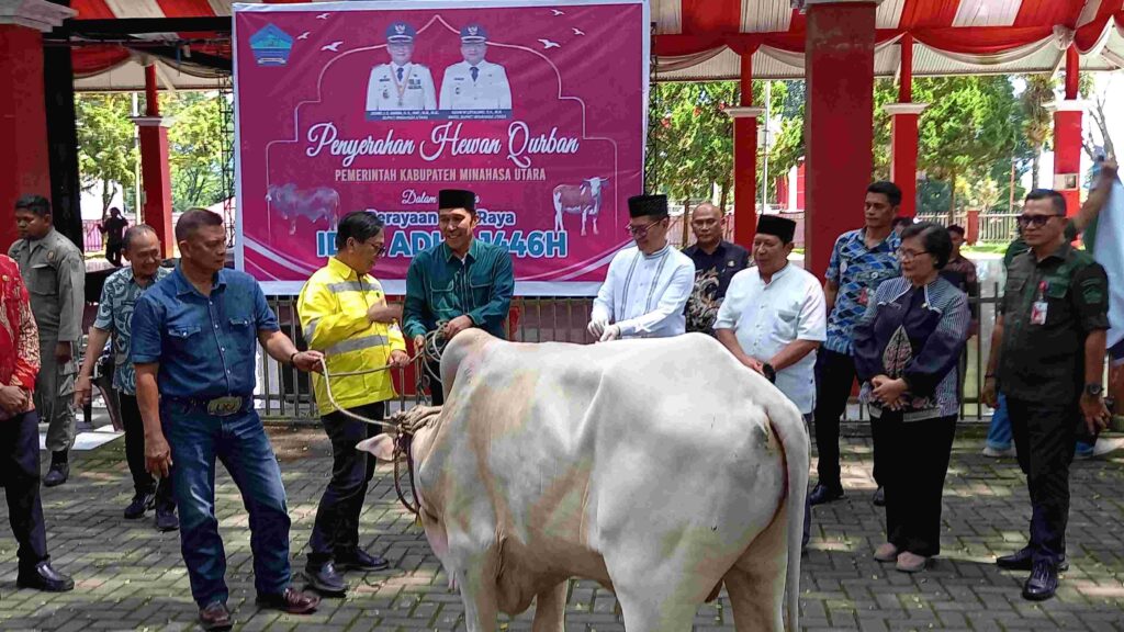 MINUT,Radarmanadoonline.com_Sehari sebelum hari raya Idul Adha 1446 Hijriah, Pemerintah Kabupaten Minahasa Utara menyerahkan bantuan hewan kurban berupa 9 ekor sapi kepada masjid-masjid penerima bantuan.