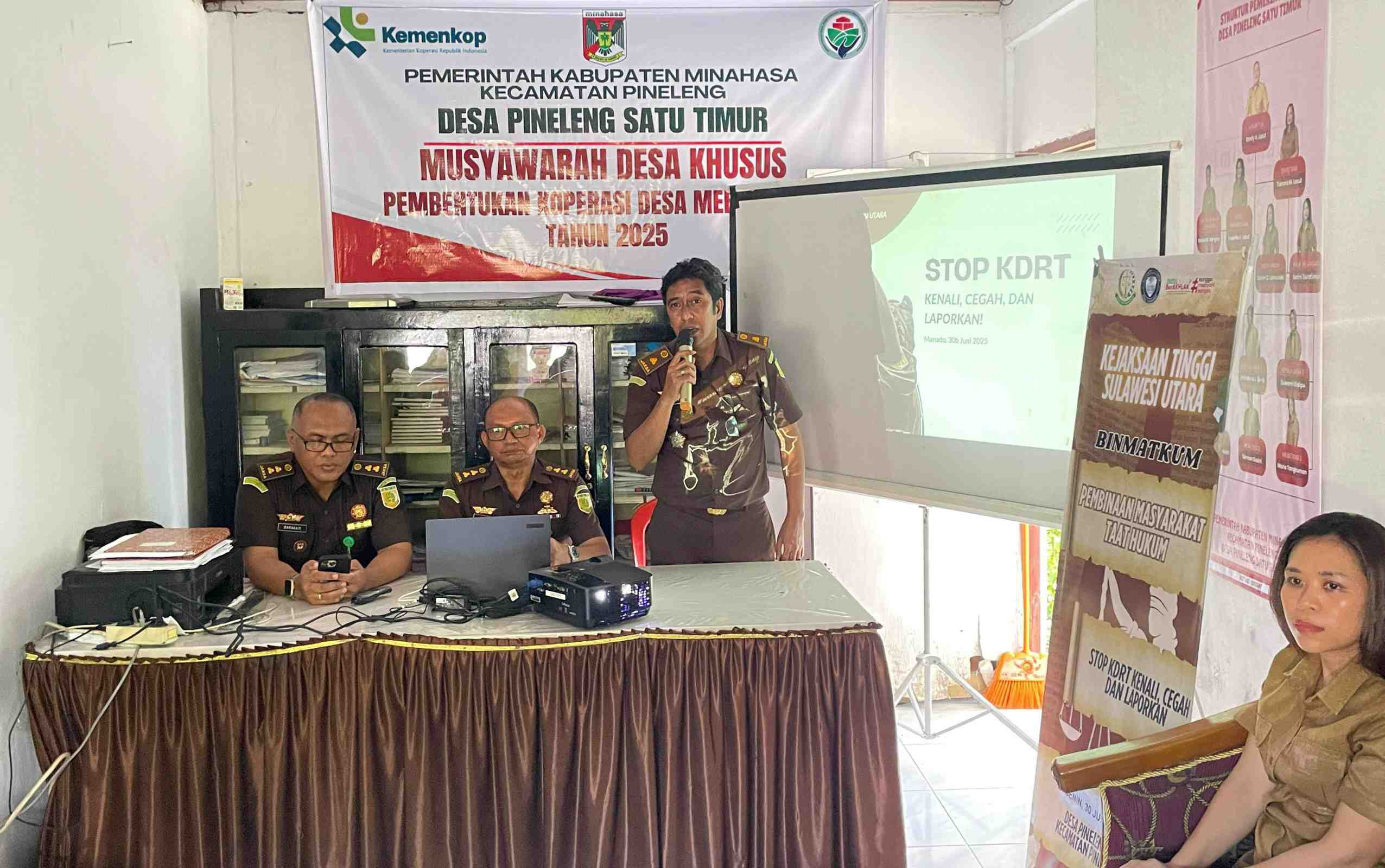 Mengangkat tema “Stop KDRT: Kenali, Cegah, dan Laporkan”, kegiatan tersebut menyasar warga desa dan perangkat setempat. Sosialisasi ini menghadirkan tiga narasumber dari Kejati Sulut yakni Januarius L. Bolitobi (Kasi Penerangan Hukum dan Humas), Nurdin, S.H., M.H. (Kasi II), dan Morais Barakati, S.H., M.H. (Plt. Kasi V).