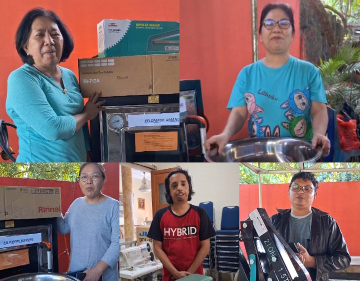 Bantuan yang diberikan mencakup peralatan produksi yang disesuaikan dengan kebutuhan masing-masing kelompok, mulai dari oven, mixer, spinner, hingga alat teknis seperti bor duduk, scroll saw, dan kompresor.