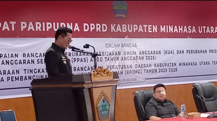 MINUT,Radarmanadonline.com_Bupati Joune Ganda dan Wakil Bupati Kevin William Lotulung menghadiri dua agenda rapat paripurna Dewan Perwakilan Rakyat Daerah (DPRD) Minahasa Utara yang berlangsung di Gedung Tumatenden DPRD Minut, Senin (28/07/25).