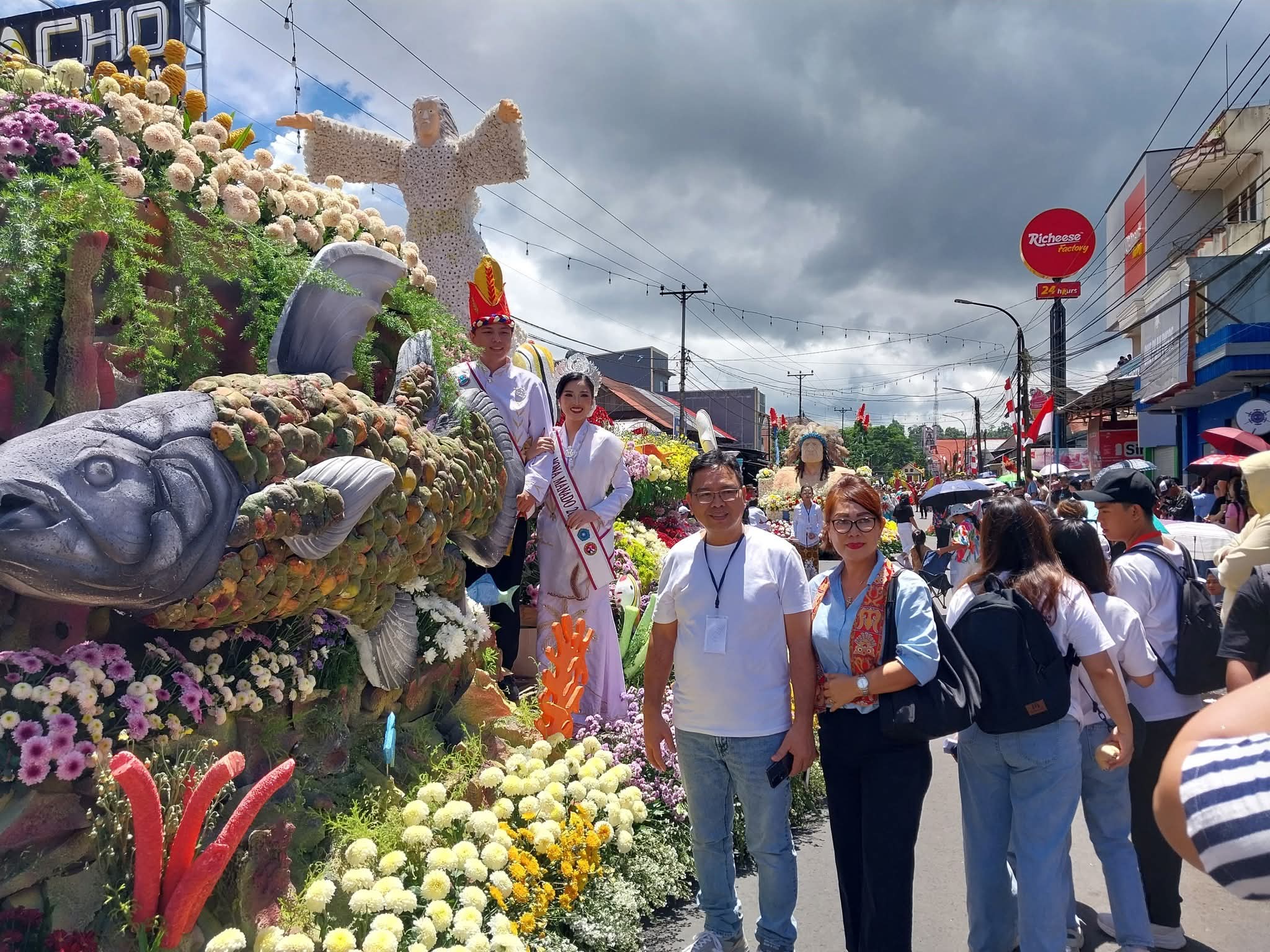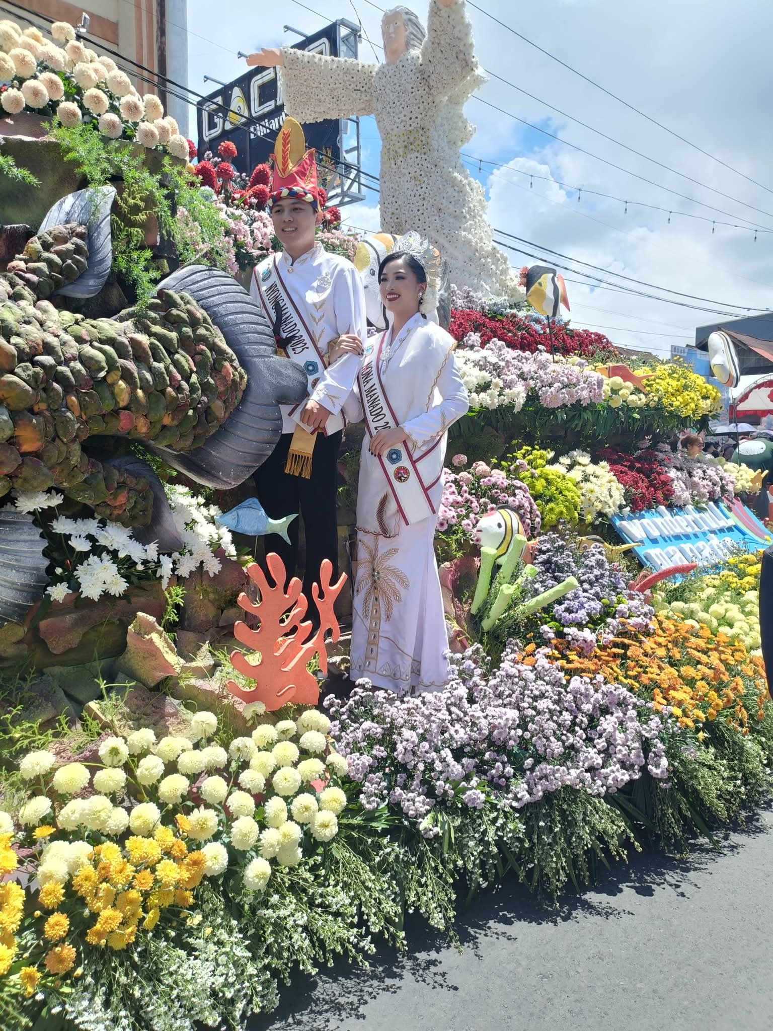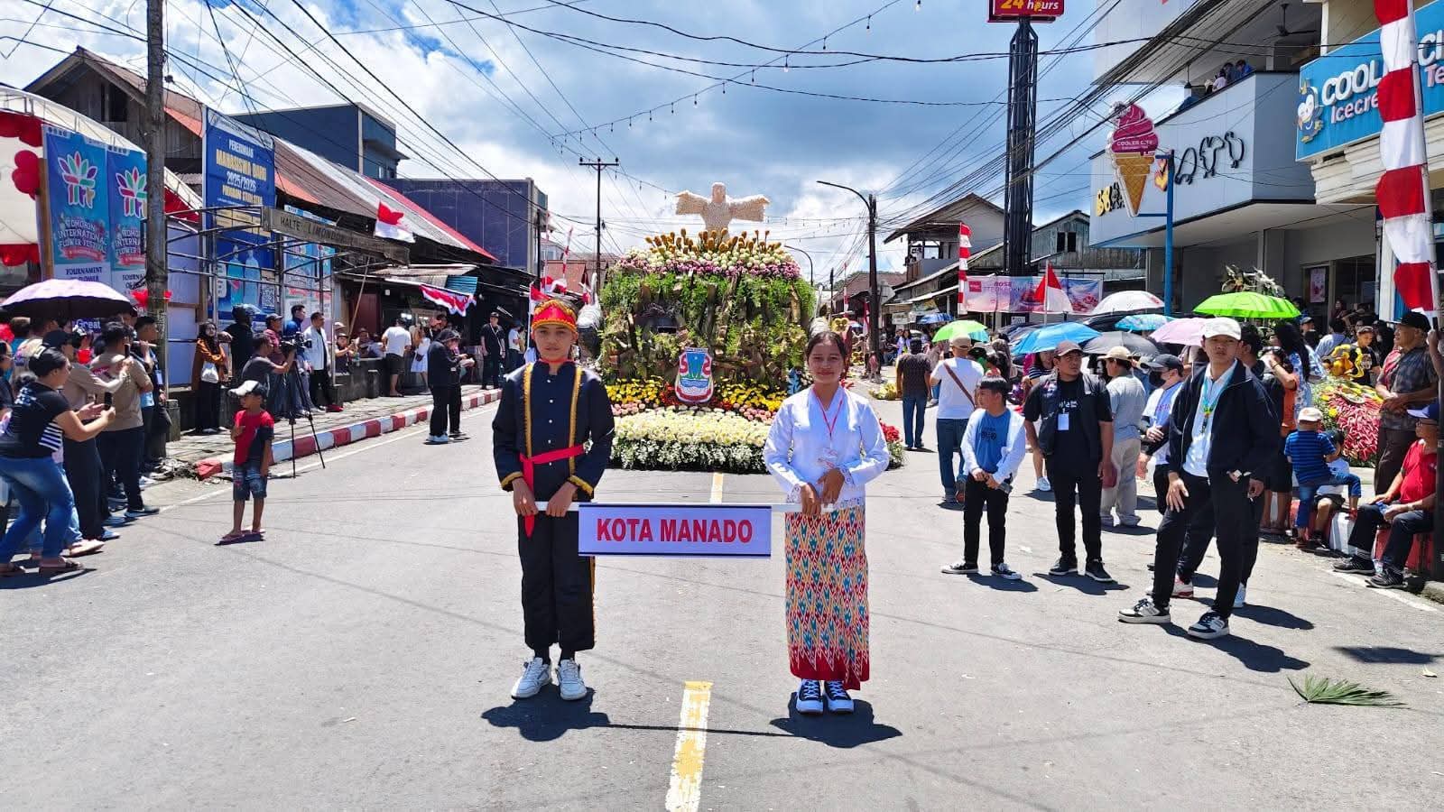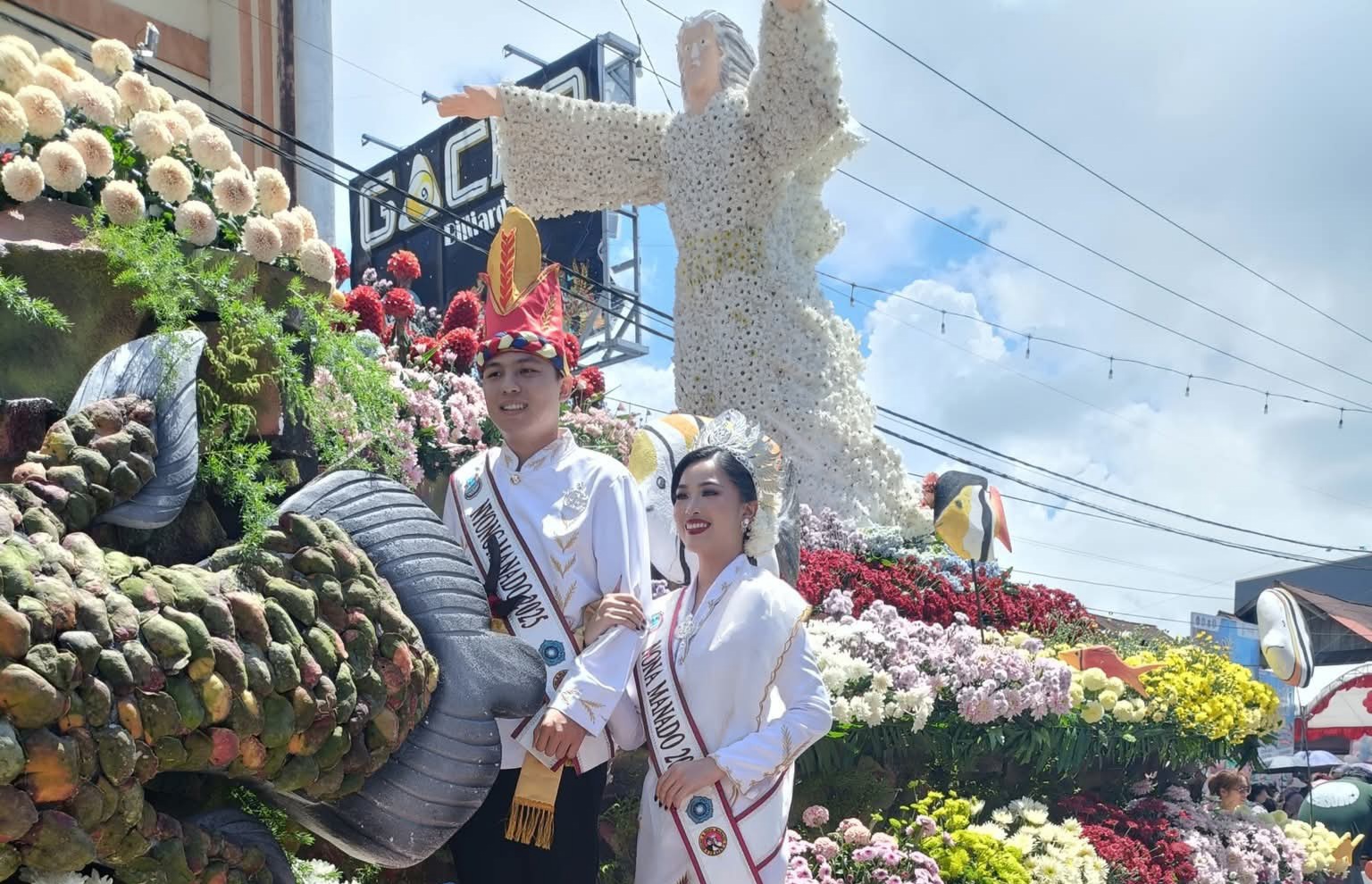 TOMOHON, Radarmanadoonline.com-Tournament of Flowers (ToF), yang merupakan rangkaian kegiatan utama dari Tomohon International Flower Festival (TIFF), berlangsung meriah, Sabtu (9/8/2025). Sebanyak 30 kendaraan hias (float) termasuk flot Pemerintah Kota (Pemkot) Manado melalui Dinas Pariwisata (Dispar) Kota Manado, tampil di acara tahunan di Kota Bunga itu. Nyong Manado 2025 Wiliam Edgan Moses Wior, S.T, dan Nona Manado 2025 Franda Benedicta Paat tampil di flot Pemkot Manado. Nyong Wiliam dan Nona Franda tampak mengenakkan busana adat Manado berwarna putih. Selain sejumlah daerah di Indonesia, lima negara juga ikut berpartisipasi di ToF 2025 ini. Kelima negara itu yakni Jepang, Amerika Serikat, Turki, Albania, Filipina. Acara yang dihadiri Menteri Pariwisata Widiyanti Putri Wardhana tersebut diawali tarian kolosal anak Maesaan Wo Kawangunan, yang menceritakan tentang sejarah Kota Tomohon. Selanjutnya, parade bunga serta karnaval busana berhiaskan bunga segar.