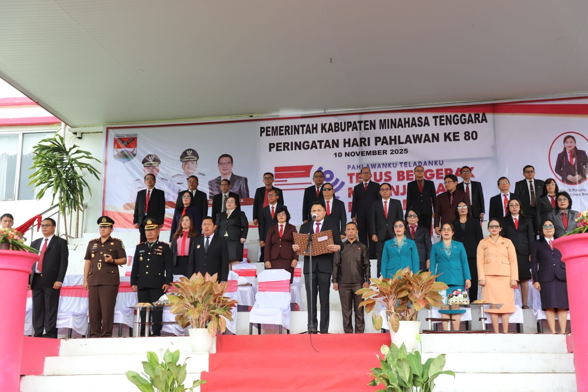 MITRA,Radarmanadoonline–Bupati Ronald Kandoli, memimpin upacara peringatan Hari Pahlawan ke-80 dengan tema “Pahlawanku Teladanku, Terus Bergerak, Melanjutkan Perjuangan”. Upacara ini dilaksanakan di lapangan kantor DPRD Kabupaten Minahasa Tenggara, Senin (10/11/2025).