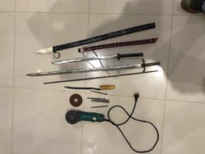 Dari lokasi, polisi menyita dua bilah samurai, enam peluru panah wayer, satu pelontar, besi panjang sekitar 90 cm, serta sejumlah peralatan seperti gurinda dan mata gurinda.