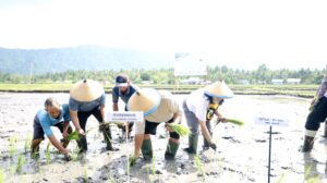Gubernur Yulius tampak ikut menanam padi bersama Bupati Bolmong serta jajaran Forkopimda setempat, disambut antusias para kelompok tani dan masyarakat Desa Solog.