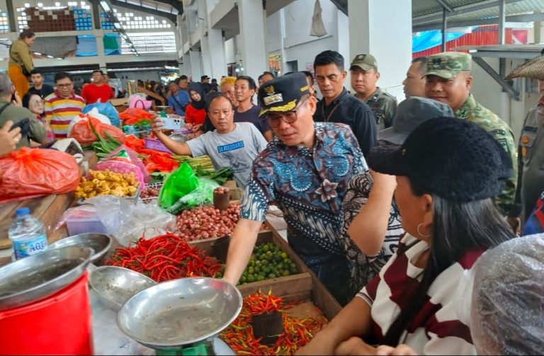 Bupati Joune Ganda meninjau langsung kondisi pasar dengan memeriksa harga serta ketersediaan bahan pokok yang dijual para pedagang, termasuk sejumlah komoditas strategis seperti cabai, bawang merah, serta daging sapi yang menjadi kebutuhan utama masyarakat menjelang hari raya.
