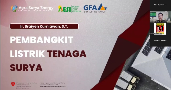 Radarmanadoonline.com, MANADO — Mahasiswa Politeknik Negeri Manado (Polimdo), khususnya dari lingkungan Jurusan Teknik Mesin, mengikuti kuliah tamu industri bertajuk Renewable Energy Lecture Series yang membahas potensi Pembangkit Listrik Tenaga Surya (PLTS) di Indonesia. Kegiatan ini dilaksanakan secara virtual melalui Zoom Webinar pada Kamis, 9 April 2026.