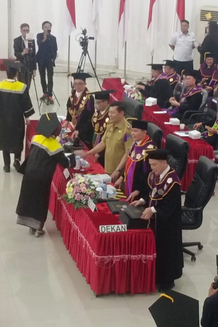 Wisuda tersebut sebagaimana biasa dilakukan di auditorium Unsrat dihadiri Rektor Unsrat Prof Dr Ir Oktovian Berty Sompie, M.Eng, IPU-Asean.Eng dan para guru besar dan dari Pemprov Wagub Sulut Dr Victor Mailangkay Sh, MH.