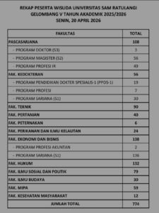 MANADO – Radarmanadoonline.com – Sebanyak 774 wisudawan menjalani prosesi penamatan di lingkungan Unsrat Manado pada Senin (20/42026).