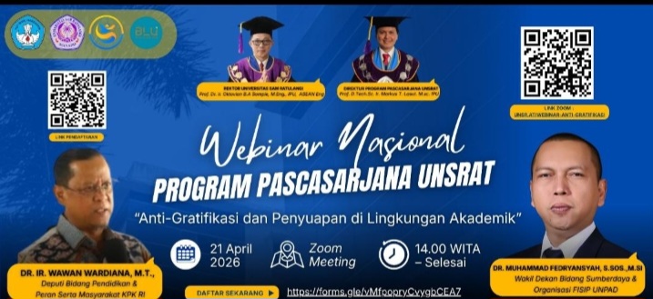 MANADO – Radarmanadoonline.com- Program Pasca Sarjana Unsrat menggelar kegiatan webinar yang terkait dengan gratifikasi dan penyuapan di lingkungan akademik.